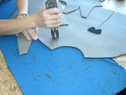ウェットスーツ生地に型紙に沿って写し、カッターで裁断します。